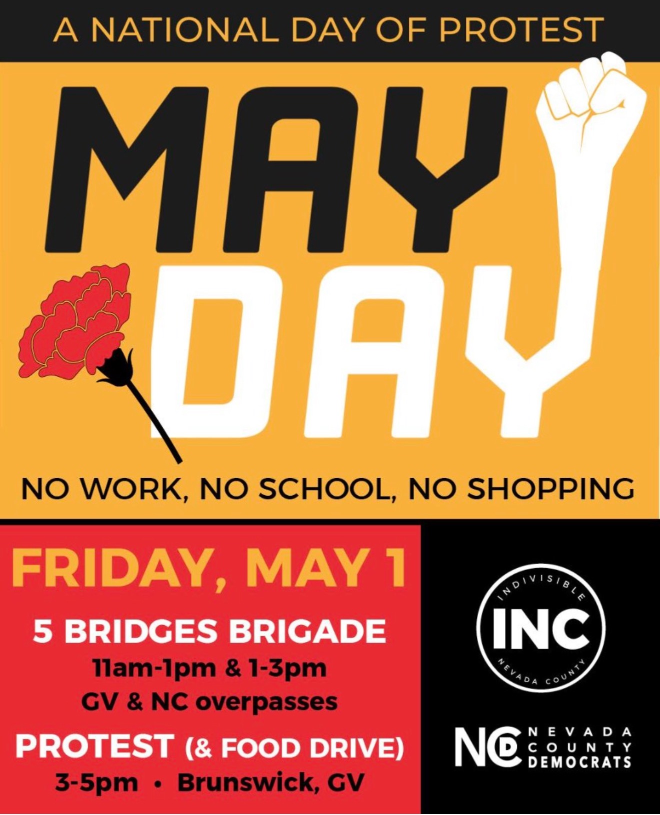 May Day is the International Workers Day. (The US created Labor Day in September to separate US workers from the internationalist socialist workers movement). Here are three ways to celebrate May Day in Nevada County, depending whether you are a liberal, or a radical. There is a national general strike from working or shopping, aimed at showing the power of the working class to elites.